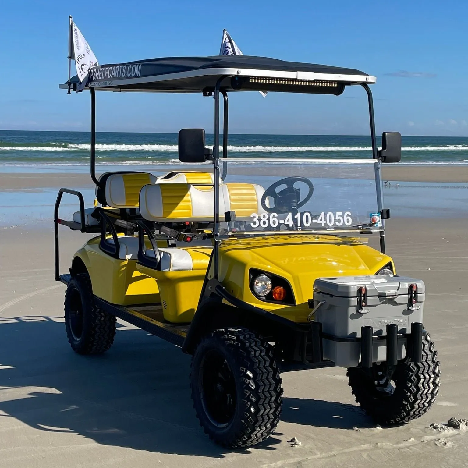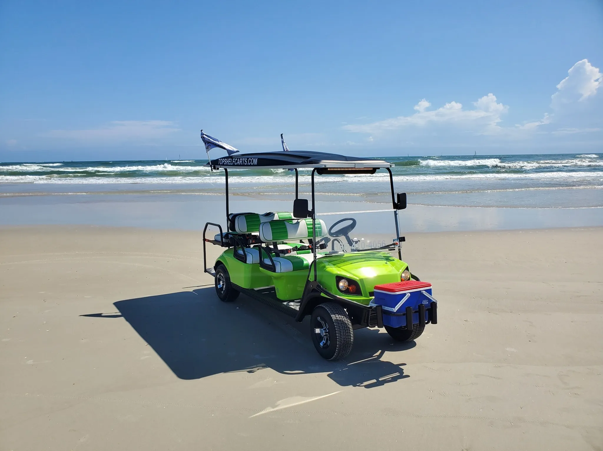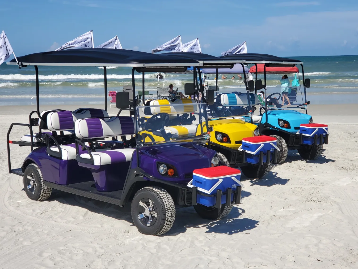 Welcome! At Top Shelf Carts, we offer you the best of the best! From rentals to repairs to customization, we are your one stop shop. Our carts are completely street legal and are perfect for your beach adventure or a fun ride around town! All of our carts come with a waterproof Bluetooth speaker, complimentary beach pass, a cooler full of ice, and free beachside delivery for 24hr+ rentals in New Smyrna Beach, Florida.